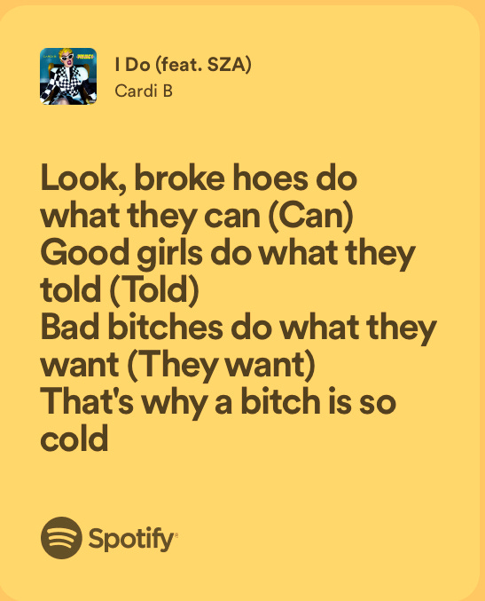 Aunty Uju would have served( excuse my Gen Z wording but she would have ate and left no crumbs) as a femme fatale. What do you mean, “I like her because she’s not like other girls”? She is the mother of the other girls. A baddie with a blinding sheen for skin who should have held The General by his balls. That man should have been so smitten and obsessed with her that if she had asked for the Head of State’s head, he would have readily provided it on a platter, no questions asked. The Aunty Uju thing pissed me off. I understand her not being like other girls but the description given showed her as a beautiful woman who had men at her beck and call (or what I interpreted it to mean ). And you cannot tell me that those friends of hers who told her to relocate to America didn’t tell her to use The General’s money to get properties and acquire businesses before things went south. She was a “good” girl. That part reminds me of Cardi B where she said: